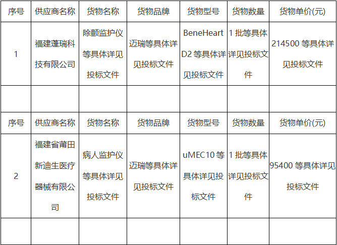 3.中标人:福建省莆田新迪生医疗器械有限公司,评审得分:91.70分;中标金额为95400元。